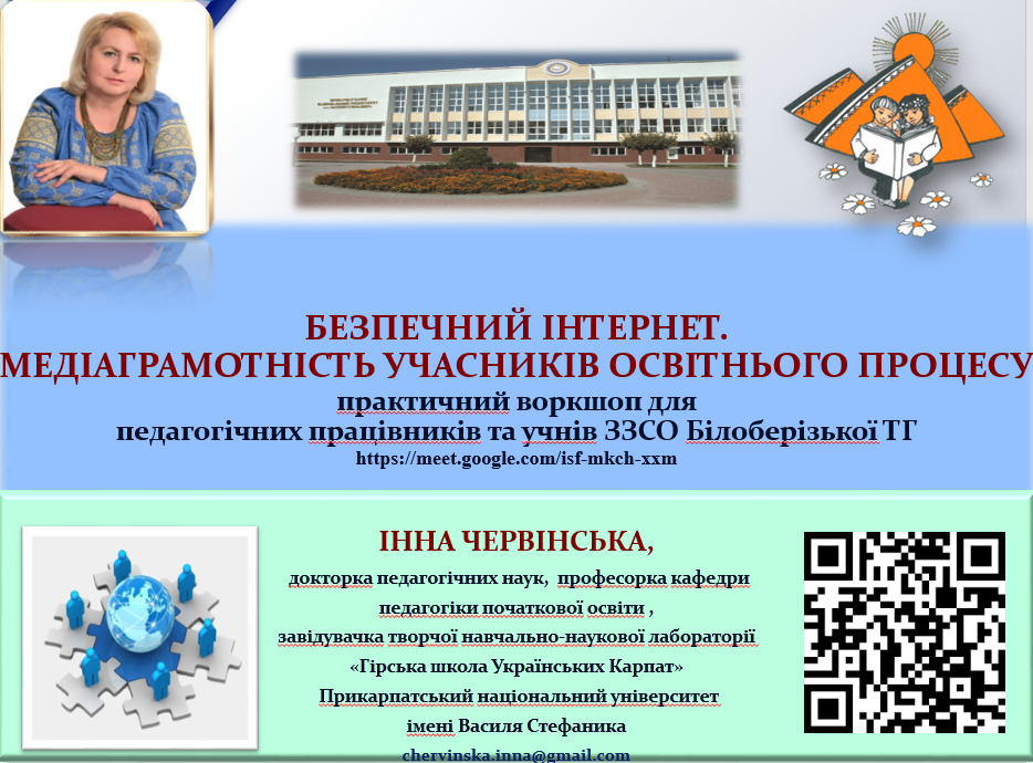 ПРАКТИЧНИЙ ВОРКШОП З ПЕДАГОГІЧНИМИ ПРАЦІВНИКАМИ ТА УЧНЯМИ ГІРСЬКИХ ШКІЛ БІЛОБЕРІЗЬКОЇ СІЛЬСЬКОЇ ТЕРИТОРІАЛЬНОЇ ГРОМАДИ У рамках всеукраїнського тижня, присвяченого проблемам безпеки в Інтернеті, завідувачка творчої навчально-наукової лабораторії «Гірська школа Українських Карпат», професорка кафедри педагогіки початкової освіти педагогічного факультету Інна Червінська провела Читати далі