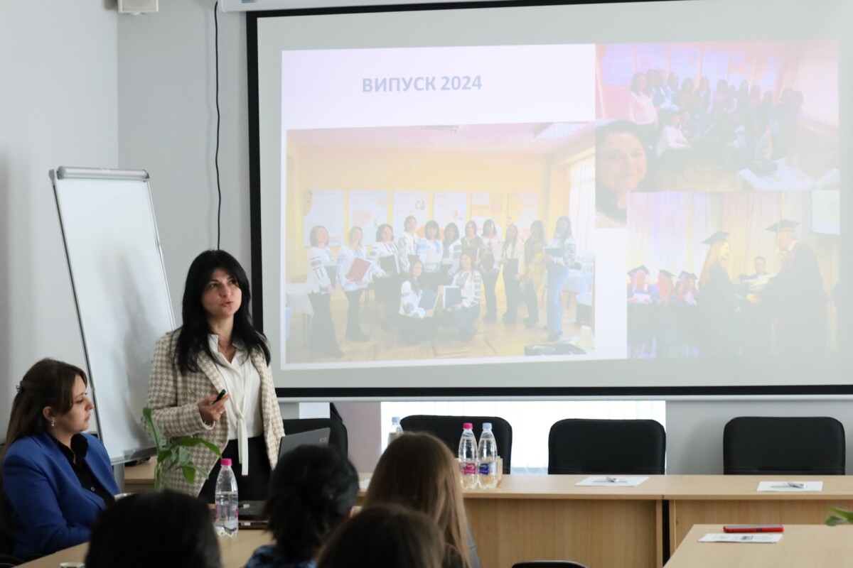 Відкриваючи захід, до його учасників звернулася з вітальним словом Оксана Кондур, яка представила команду викладачів університету, ознайомила з програмою візиту. А Галина Дмитроняк презентувала присутнім напрацювання освітян громади, розповіла про успішну реалізацію низки міжнародних грантових проєктів, окреслила проблеми та перспективи розвитку закладів освіти на майбутнє.